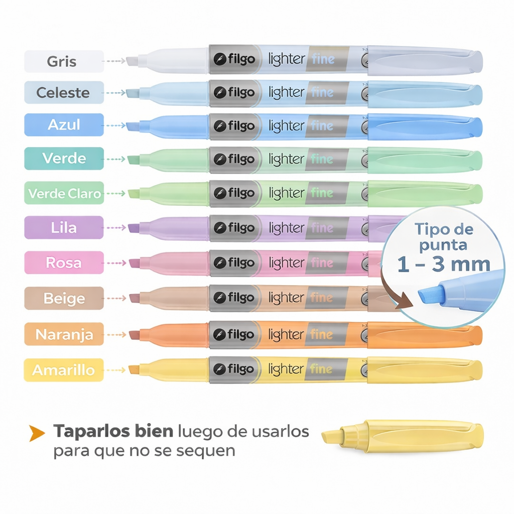 Descubrí los Resaltadores Filgo Lighter fine x10 Pastel, la herramienta perfecta para resaltar, dibujar, pintar y hacer lettering con precisión y estilo.